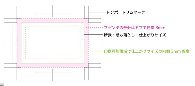 ちなみに一般的なところで緑色の部分ですが仕上がりサイズから3mm内側の部分の事です、これは印刷可能領域と言って、印刷する際安全に印刷できる範囲となります、これより内側に文字などを入れておけば文字が切れる心配もないということです。